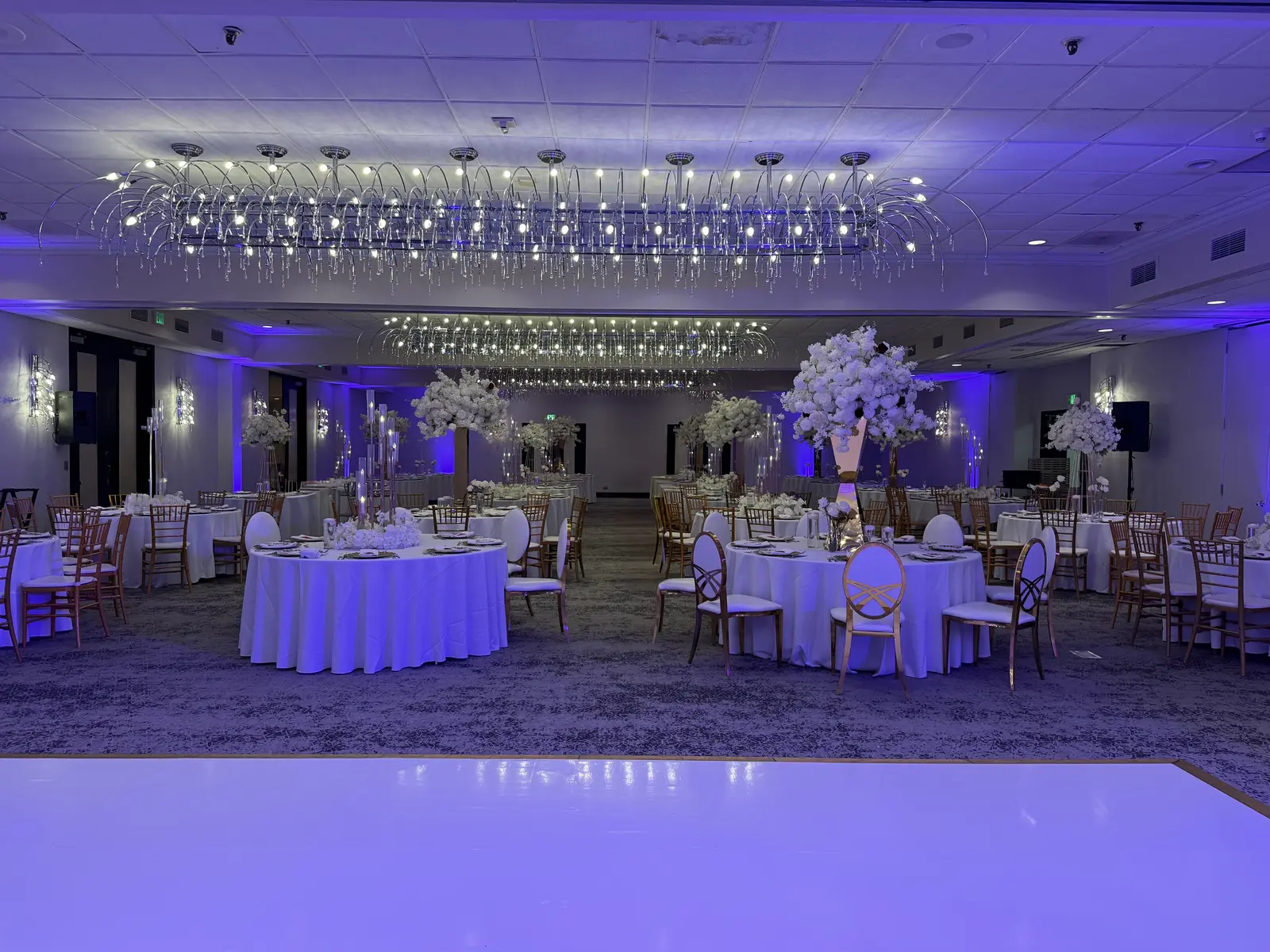 Uplighting is the rental that actually transforms a room. 8 to 12 small LED fixtures placed around the walls, washing the space in the couple's wedding colors. Warm tones during dinner, deeper or more saturated tones as the dance floor opens. Intentional, photographable, and calm enough to not compete with the food or the faces.